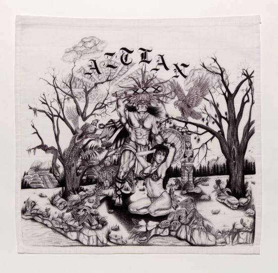 Rendering of Aztec warrior and kneeling woman flanked by two trees in a fantasy landscape.