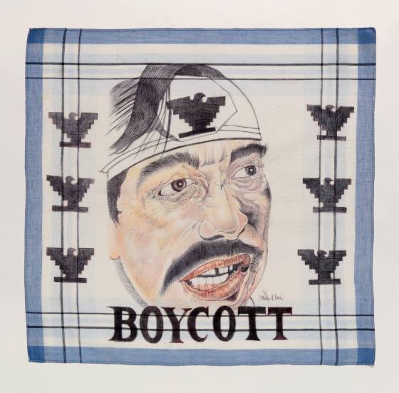 Man wearing a United Farm Workers bandana as headband with UFW eagles present on each side.
