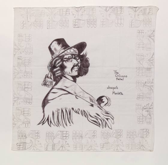 Male figure facing right while gazing at the viewer. Referencing image of Joaquin Murrieta.