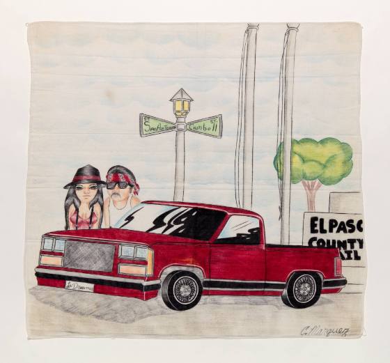 Man and woman standing behind a red pick-up truck parked in front of the El Paso County Jail; San Antonio Street / Cambell St Street signs.
