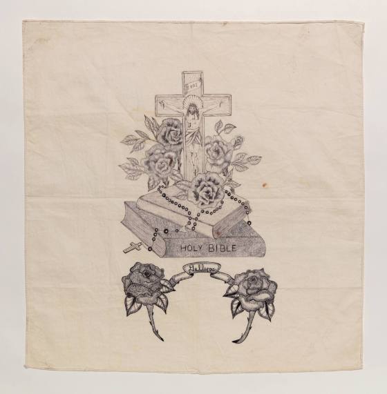 Small "altar" arrangement with Bible and prayerbook, rosary, crucifix and roses.