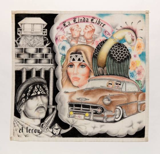 Depicts person in bandana with prison tower in black and white; thought bubble depicts woman, peacock, and man and woman in a brown Chevy lowrider - license plate is Anthony, NM