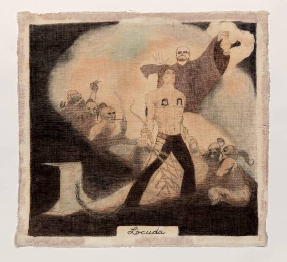 Image of a man chained to a pillar and restrained by rope webbing; skeletal figure with censor at top of composition.
