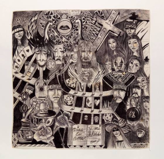 Series of faces mixed with Christ figure, cross with words "Por Que," masks and bars of prison cell; text at top: Nuestro Destino; text at bottom: Dios es Amor y mi Salvador Ben Jo 99.