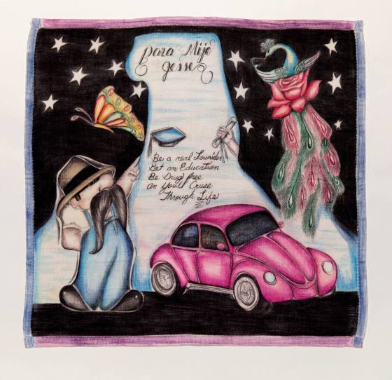 Dedication: "Para Mijo Jesse - Be a Real Lowrider - Get an Education - Be Drug Free - An youll cruse through life." Images include a Volks Wagon Beetle, peacock, butterfly, and a man with a long mustache.
