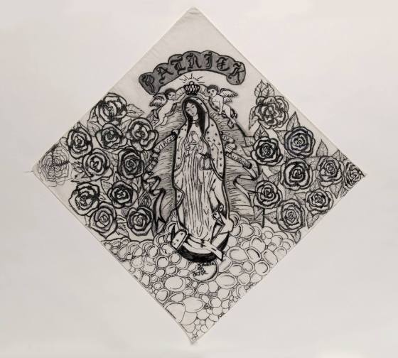 Virgin of Guadalupe represented in typical form; banner at top of composition "Patrick"; executed in black and white.
