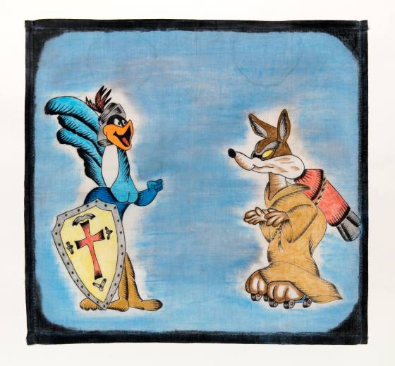 Rendered in color: Wile E. Coyote wearing a monk's robe, roller skates and a jet pack. Roadrunner as a crusader / knight.