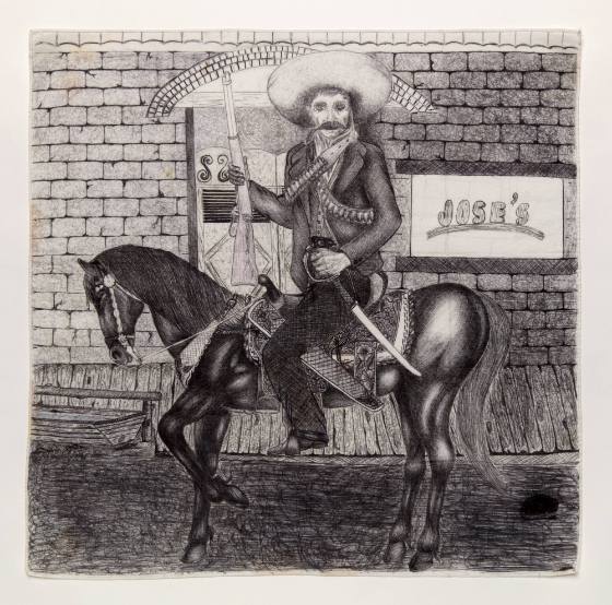 Horse with mounted rider holding a rifle; situated in front of Jose's saloon; Emilio Zapata references.