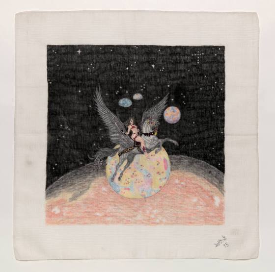 Woman riding a winged black horse or pegasus in outer space.