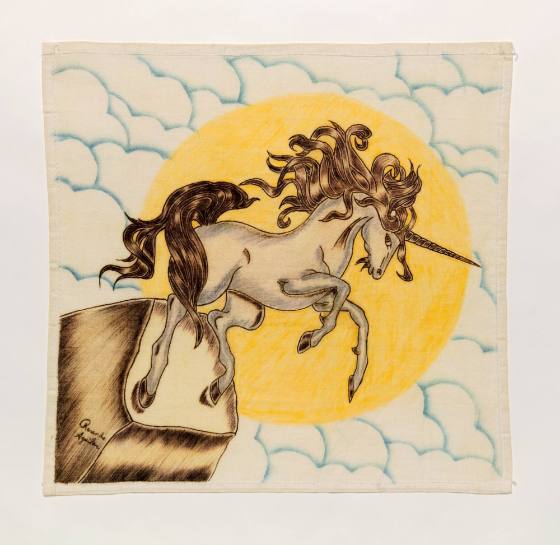 Executed on diagonal; Unicorn placed in front of a large yellow disk (sun) with clouds in the background.