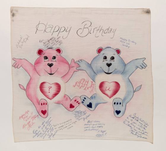 Pink and blue Care Bears with text: Happy Birthday; several hand-written greetings.