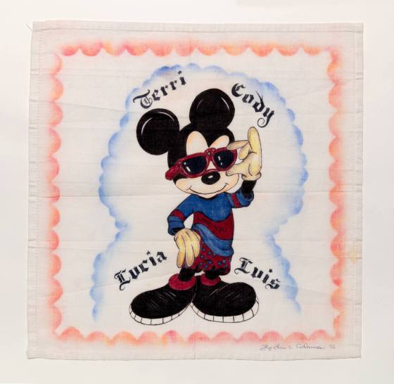 Mickey Mouse (blue sweat shirt and red shades) surrounded by names: Terri, Cody, Lucia, Luis.