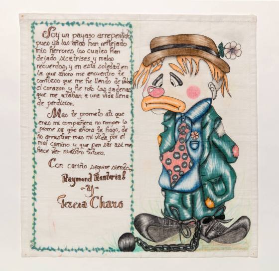 Sad clown with legs shackled and placed in right half of composition; left half is text: "Soy un payaso arrepentido pues los años han reflejado mis herrores los cuales han dejado sicatrises y malos recuerdos, y en esta soledad en la que ahora me encuentro te confieso que me fie llendo de valor el corazon y fie roto las cadernas que me ataban a una vida llena de perdicion. Mas te prometo ati que eres mi compañera no romper la prome sa que ahora te fiago, de no arrastrar mas mi vida por el mal camino y que pen sar asi me hace ver nuestro futuro. Con cariño seguire siendo, Raymond Rentarie y Teresa Charo