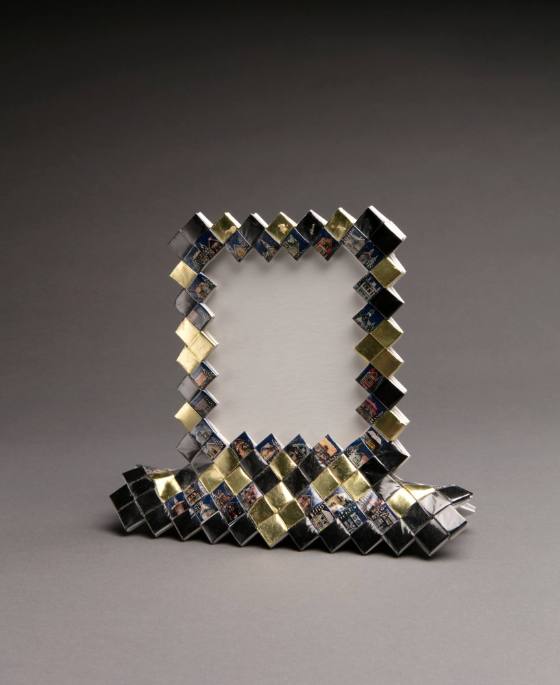 A woven picture frame made out of black, gold and gray wrappers.