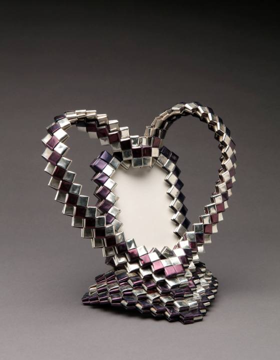 A purple and silver heart-shaped photo frame.