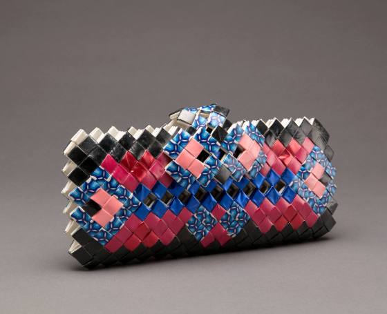 A pocketbook made out of black, pink, maroon and blue patterned wrappers.