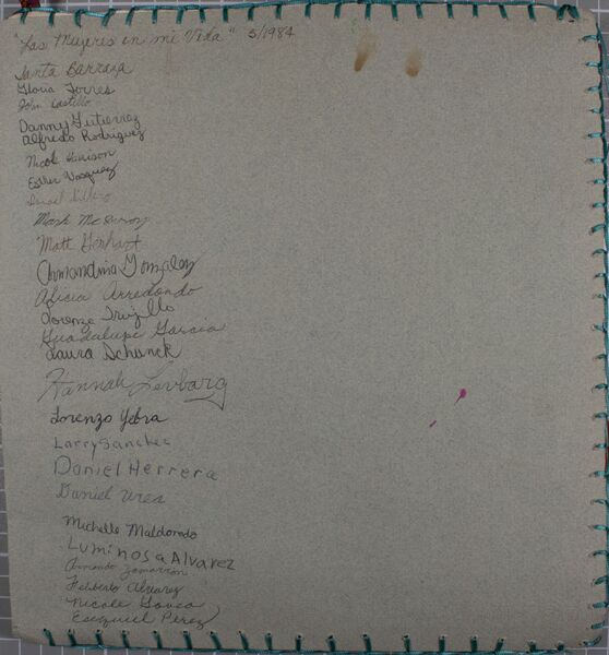 This artist book was inspired by elementary school students whom the artist taught to produce artist books. The image captures the students' signatures which appear on the first back panel of the book. The artwork honors the women in her life, including Coatlicue, Guadalupe, Barraza’s great-grandmother, grandmothers, mother, and her daughter, Andrea. This is a mixed media work with ribbons, milagros of amate paper, tulle, lace, thread, hair, appropriated family photos, glitter, sequins, safety pins, and hand-colored prints and photocopies. It also includes a self-portrait panel. Artist book. Opened dimensions: 10 ¾” x 80"
