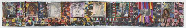 This artist book was influenced by Mesoamerican codices, designed with thirteen boxes surrounding each of the eight figures. The work honors the women in her life, including Coatlicue, Guadalupe, Barraza’s great-grandmother, grandmothers, mother, and her daughter, Andrea. The veils covering five of the figures indicate that the women are no longer with us. The artist's creative process was inspired by elementary school students whom the artist taught to produce artist books. The students' signatures appear on the first back panel of the book. This is a mixed media work with ribbons, milagros of amate paper, tulle, lace, thread, hair, appropriated family photos, glitter, sequins, safety pins, and hand-colored prints and photocopies. It also includes a self-portrait panel. Artist book. Opened dimensions: 10 ¾” x 80"