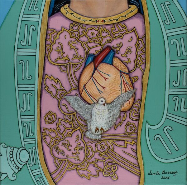 From the Torso Series, the artist appropriates her own image of La Virgen Indigena (2016), focusing on the midsection of Guadalupe. The image is extended around the frame, making it appear three-dimensional and sculptural. The painting includes symbols, such as the dove representing peace and the Holy Spirit, and Mesoamerican hieroglyphs, such as the canto icon in the lower left. The gown is adorned with a band found in Mesoamerican codices. Acrylic on canvas. Dimensions: 12" x 12"