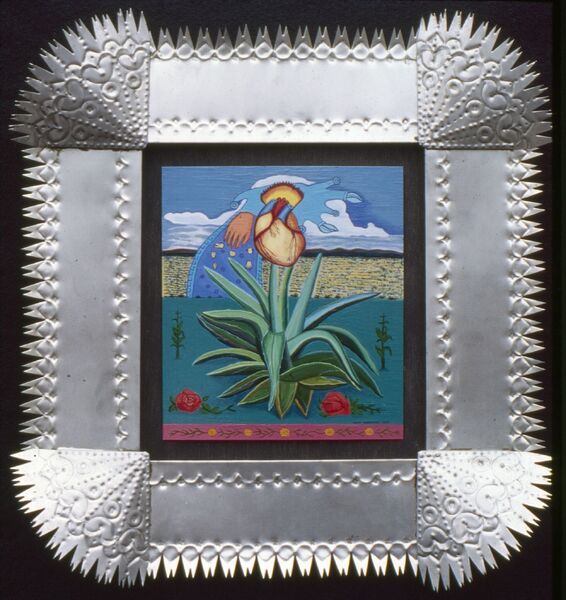 From the Retablo Series, this painting portrays a maguey, the Sacred Heart, clouds, water, and Tlaloc's hand, which fertilizes the earth. Tlaloc's presence is informed by the Tepantitla murals at Teotihuacan. Richard Dennis created the metal frame, which he fabricated for the artist. Enamel and oil on metal with metal frame. Dimensions: 15 ½" x 16 ½" x 1"