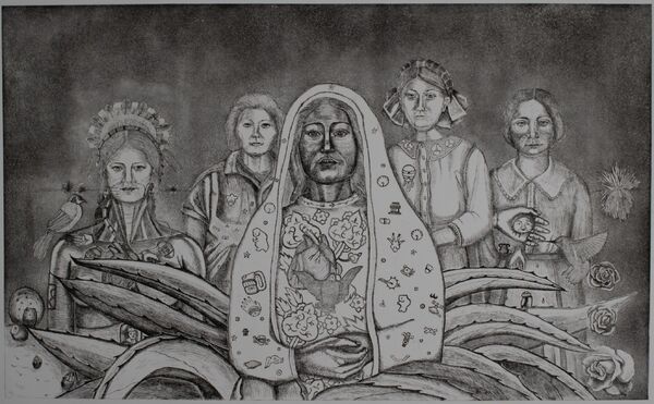 The artist was invited to create a print at Talleres del Centro Cultural Antiguo Colegio Jesuita, in Pátzcuaro, Michoacán, in preparation for the exhibition, Blanco y Negro at the Museo Nacional de la Estampa in Mexico City. She created this image to honor the women in her life. Guadalupe, the central image, represents mestizaje, empowerment, and the Americas. The other figures from left to right are the goddess Coyolxauhqui, the artist's mother, her grandmother, and Petra Vela de Vidal Kenedy (1823-1885), the matriarch of the Kenedy Ranch in Sarita, Texas. Coyolxauhqui wears Coatlicue's necklace of hearts and hands. Nopales and the green jay locate the artist in South Texas. Etching on copper. Dimensions of image: 24" x 38 ¾”