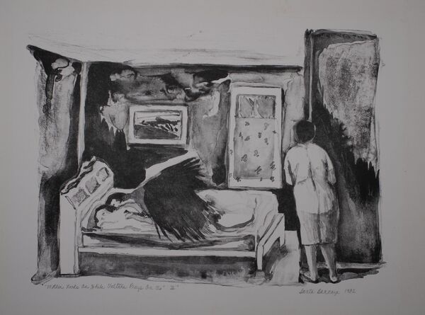 This print is from the Dream Series. The image depicts the artist and her daughter in bed with a vulture sitting on them. The artist's mother stands near the door, innocently looking on but not assisting. Lithography. Dimensions of the image: 10 ½” x 14 ¾”