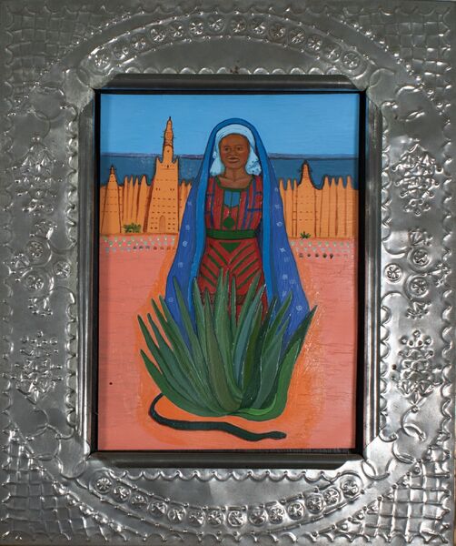From the Retablo Series, this painting depicts the Black Madonna emerging from the maguey. The background is the cityscape of Djenné, Mali, known for its adobe architecture. This painting is informed by research conducted in Mexico. Richard Dennis created and signed the metal frame in 1992 (#15), which he fabricated for the artist. Oil on metal with metal frame. Dimensions: 17" x 14" x 1"
